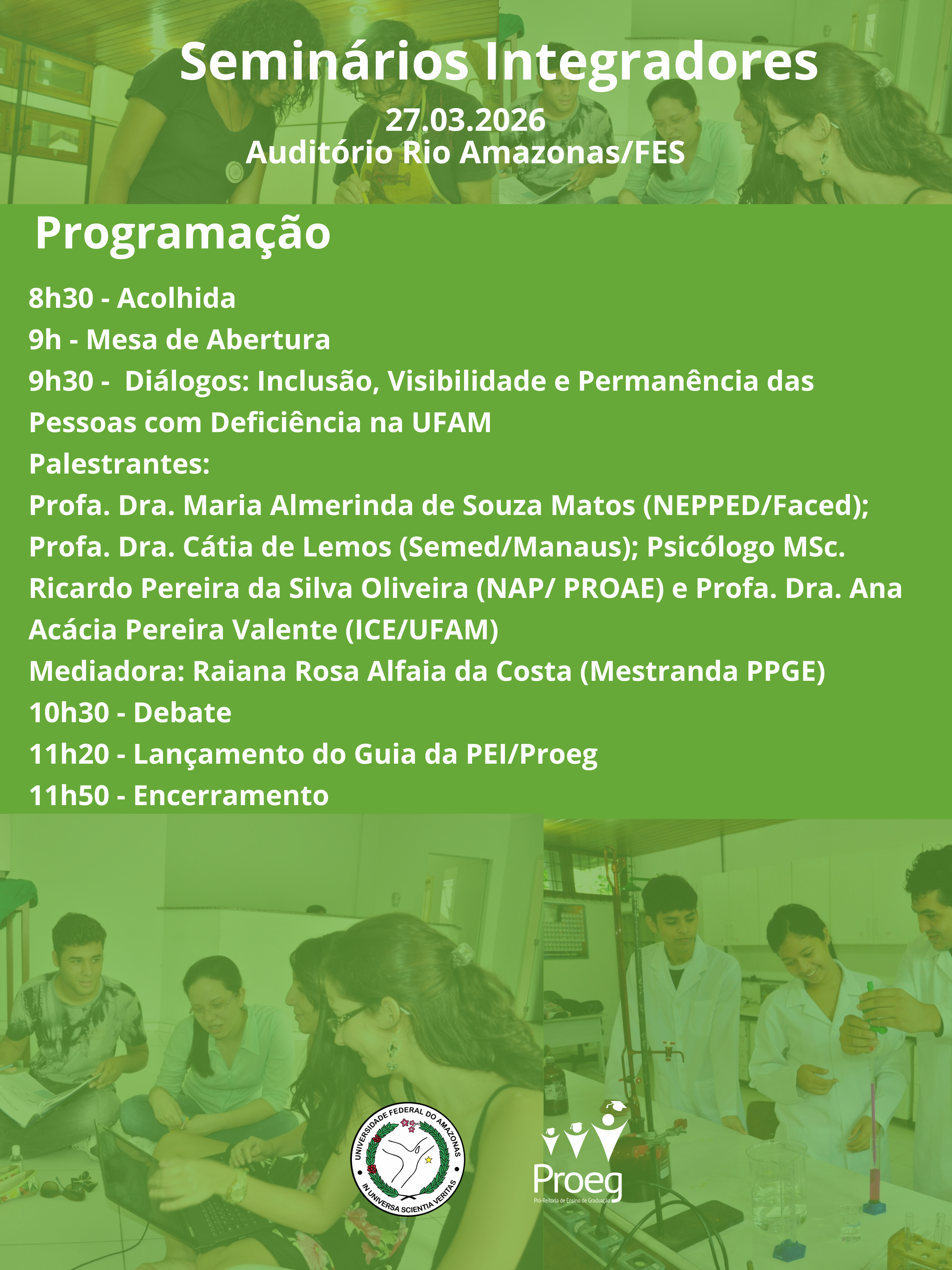 O primeiro Encontro ampliado tem como tema “Diálogos sobre “Inclusão, Visibilidade e Permanência das Pessoas com Deficiência na UFAM” e ocorre no dia 27/03/2026, às 9h, no auditório Rio Amazonas, da Faculdade de Estudos Sociais/FES.